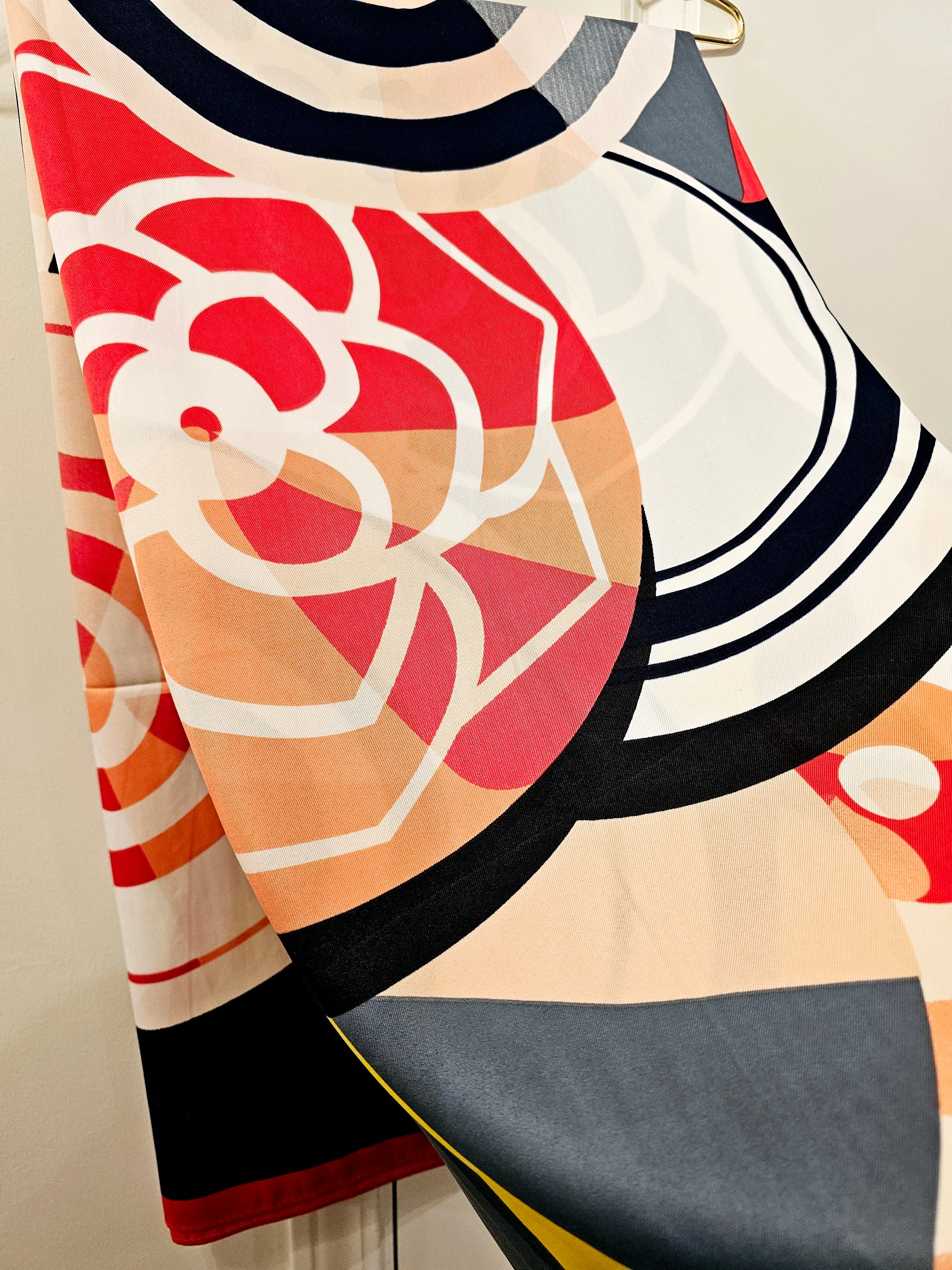 130cm circle and shapes pattern Twill Silk Square Scarf is a testament to timeless fashion. Its a classic choice for women's accessories, adds a touch of sophistication to any outfit. Whether you're dressing up for a special occasion or looking for a chic accessory to complement your casual attire, this scarf is versatile enough to suit various styles and settings. Its silk twill material ensures a soft, luxurious feel that drapes beautifully, making it an ideal choice for all seasons.