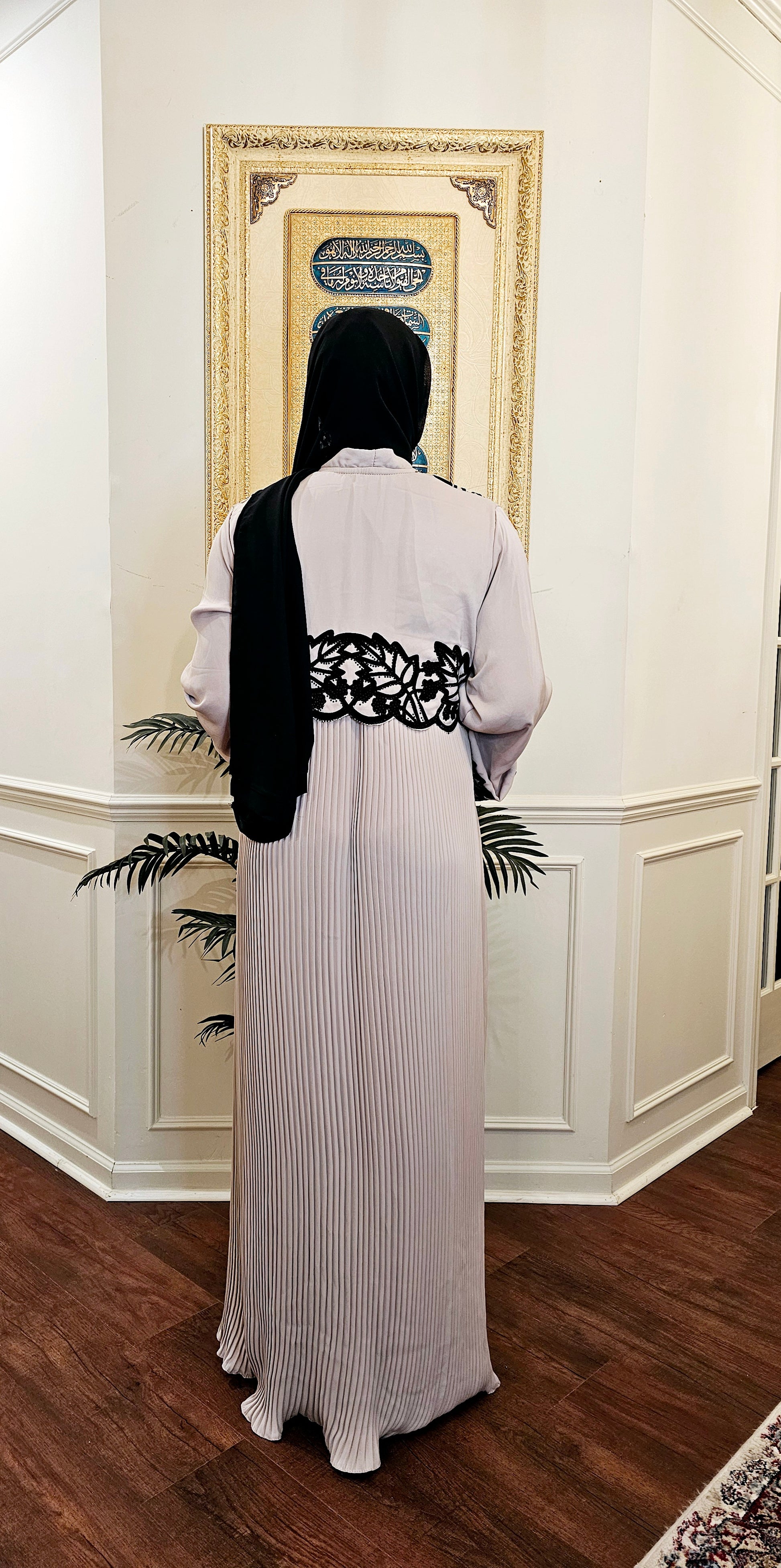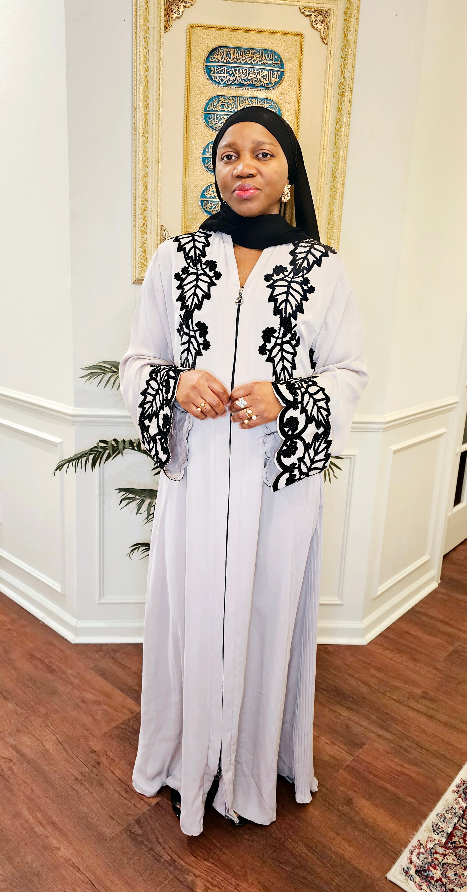 This is a one piece Abaya dress with detailed embroidery and pleats on the front, sleeves and back.